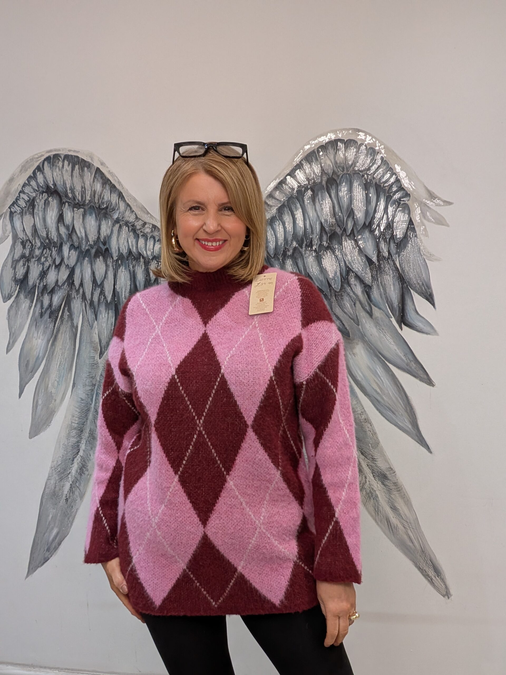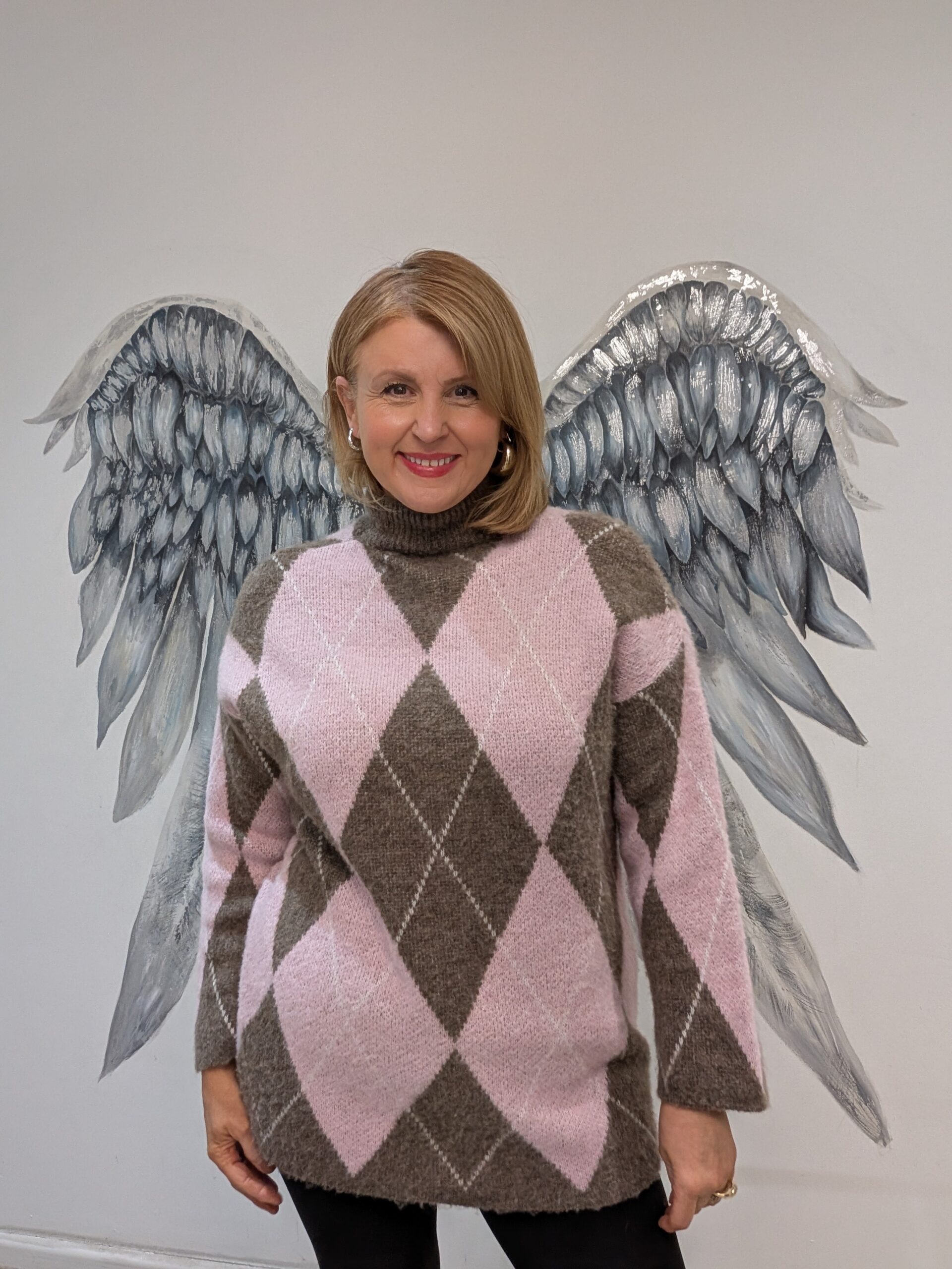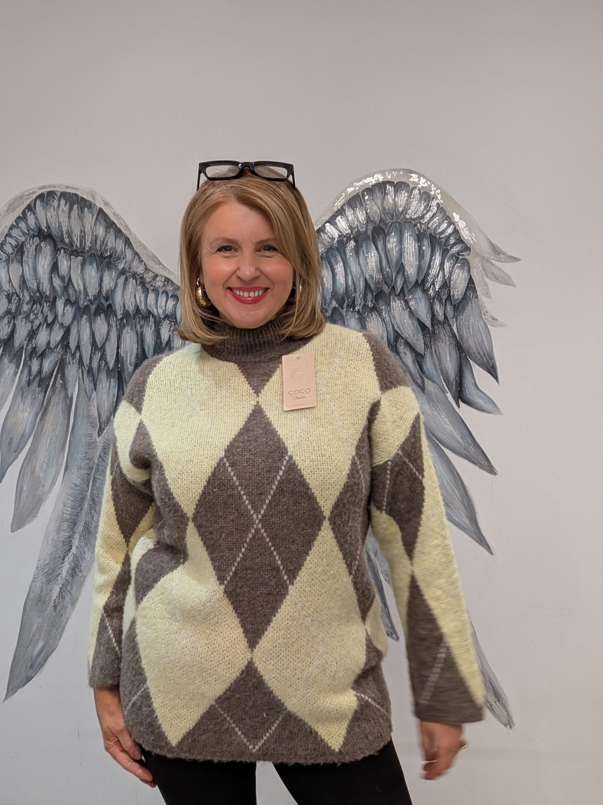 Stanning super soft turtle neck on trend Harlequin pattern jumper