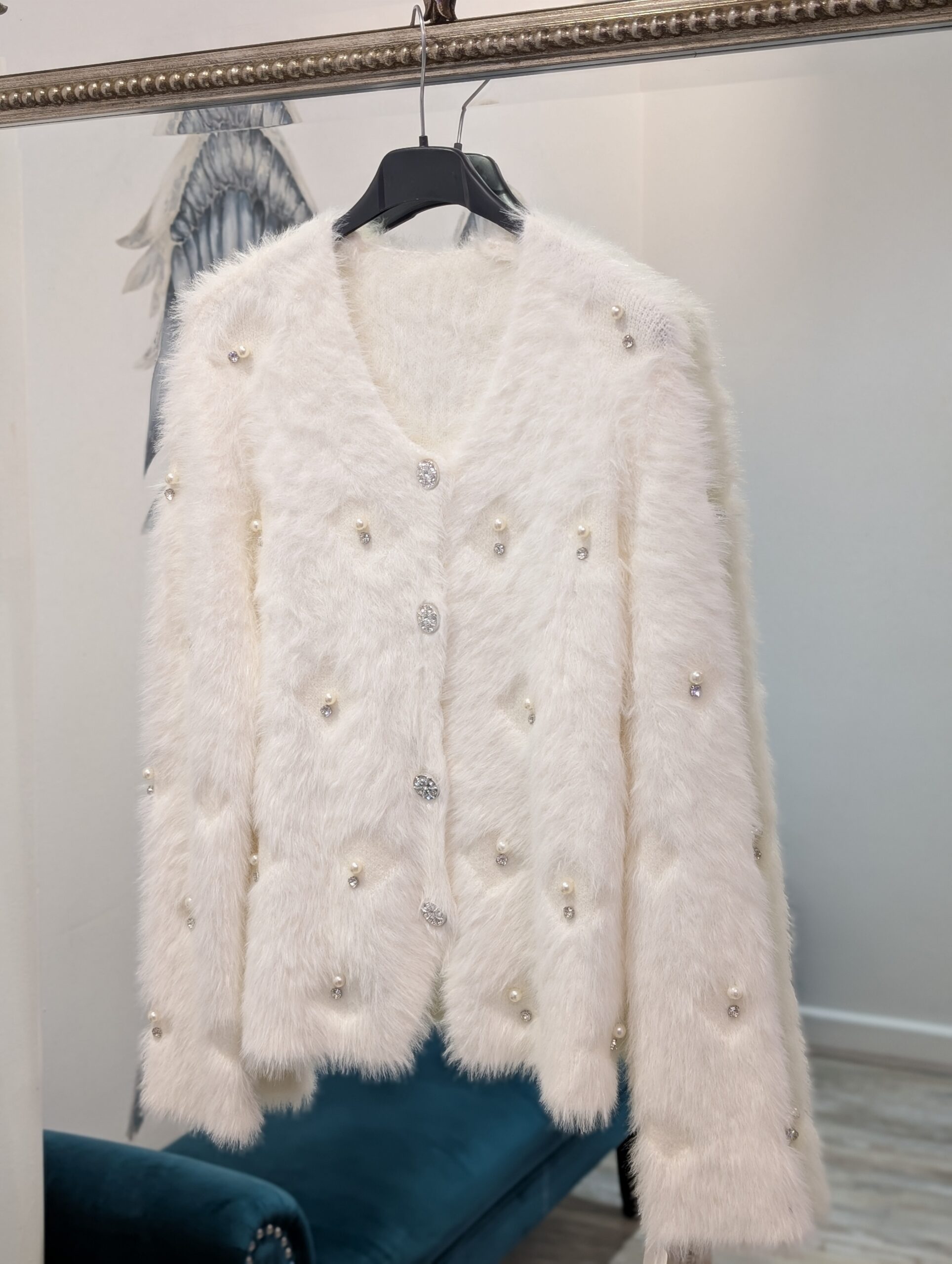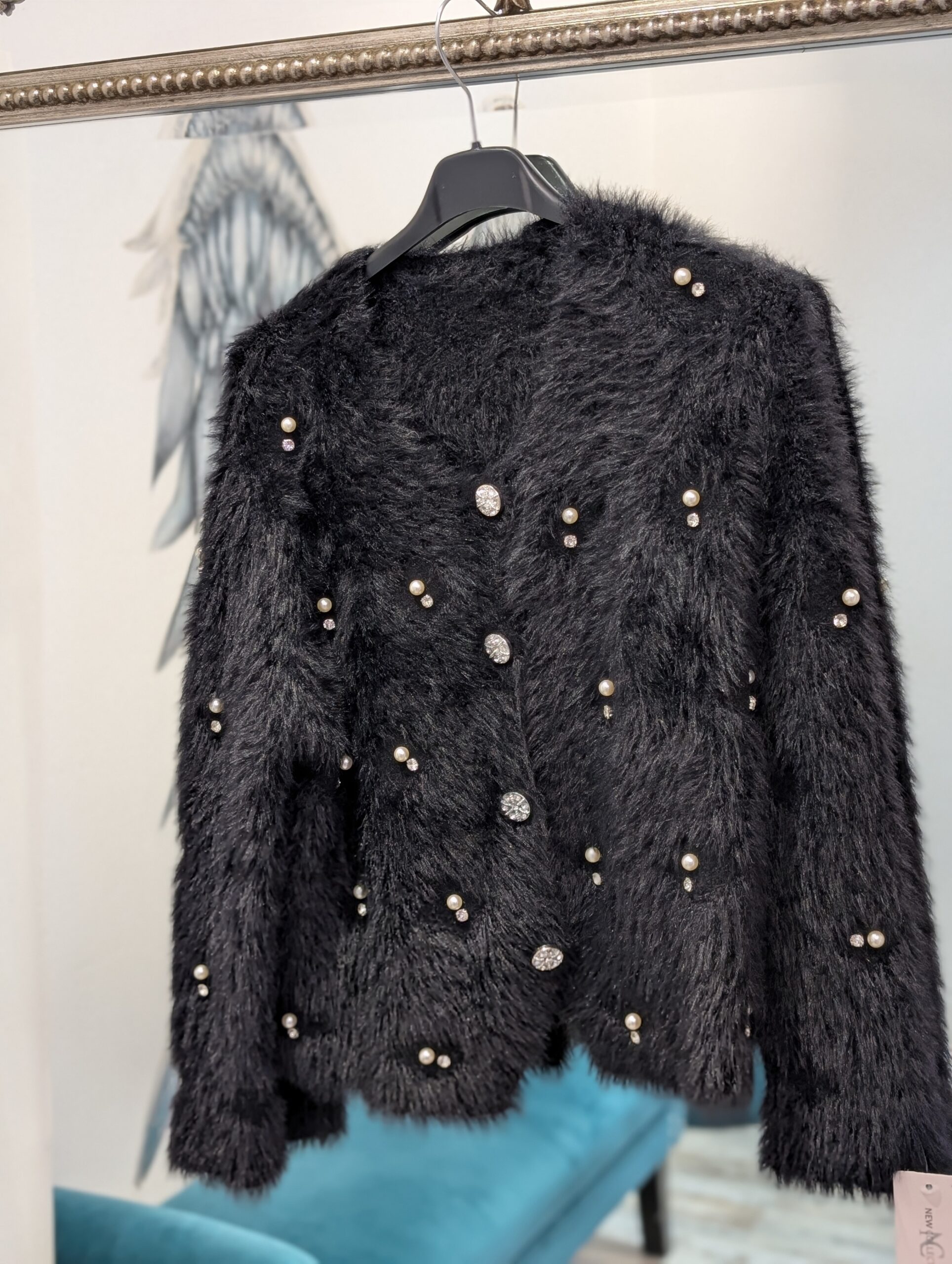 Gorgeous fluffy cardigan with pearl and diamond details with beautiful embellished buttons down the front to fasten x