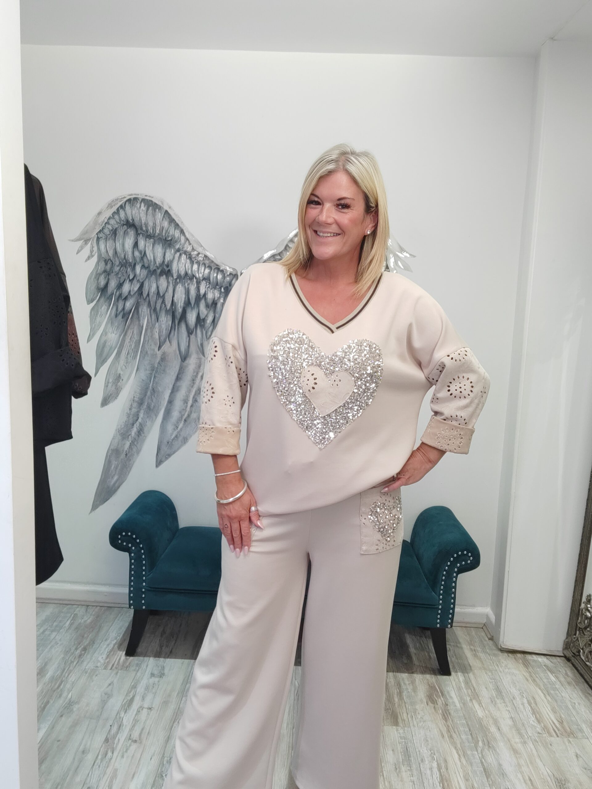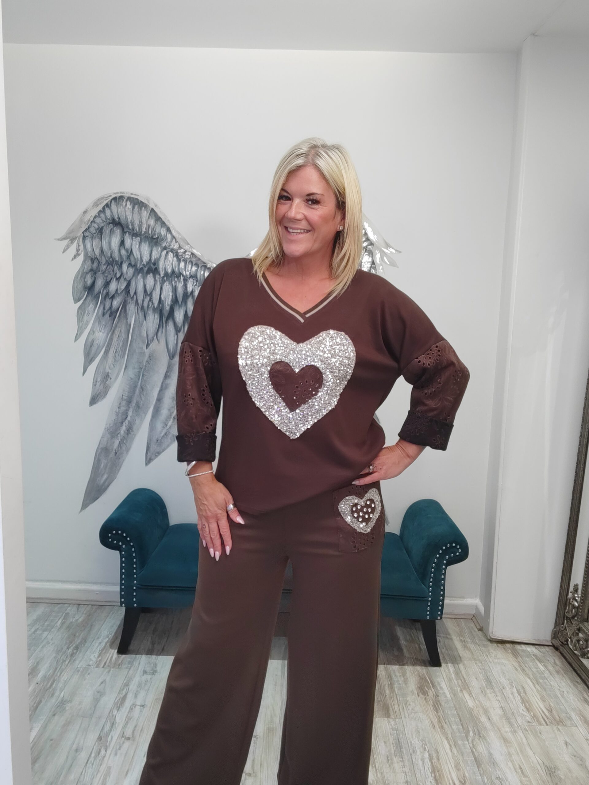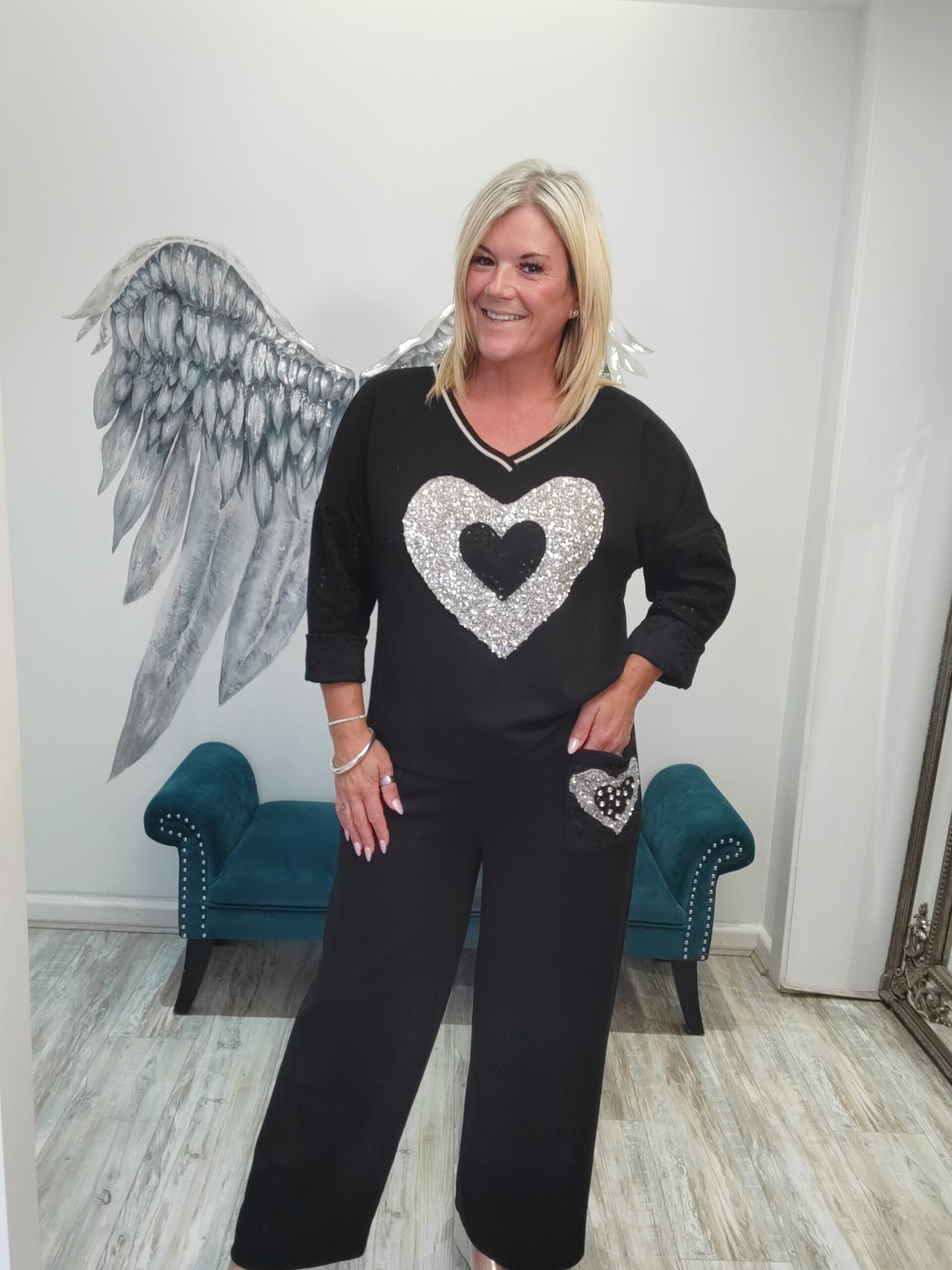 Fabulous wide leg Co-ord with gorgeous sparkle heart at the front of the top and lovely suede broderie anglaise ffel. The bottoms are a wide leg with the suede feel pockets with a diamante heart on one, elasticated waist x