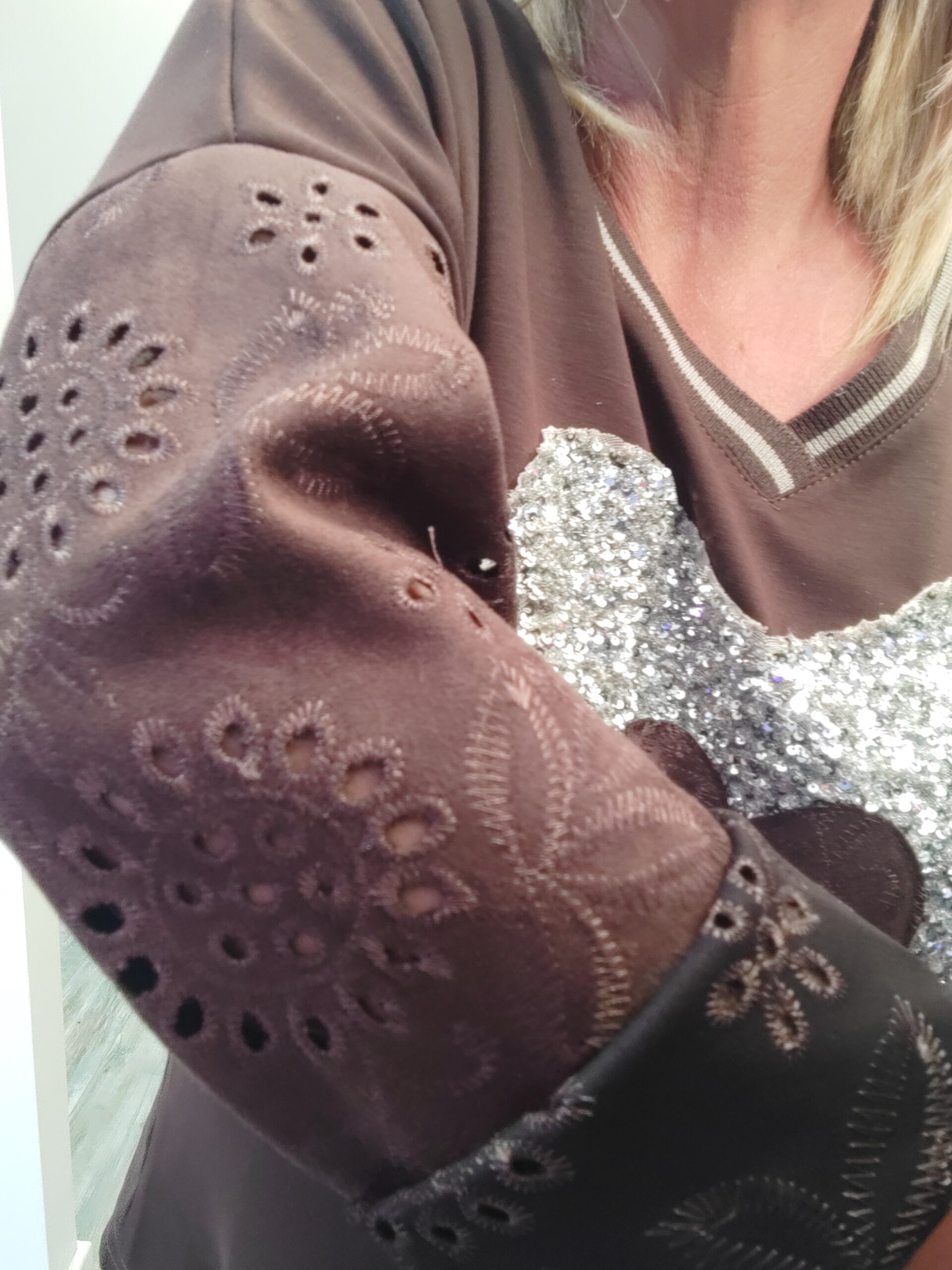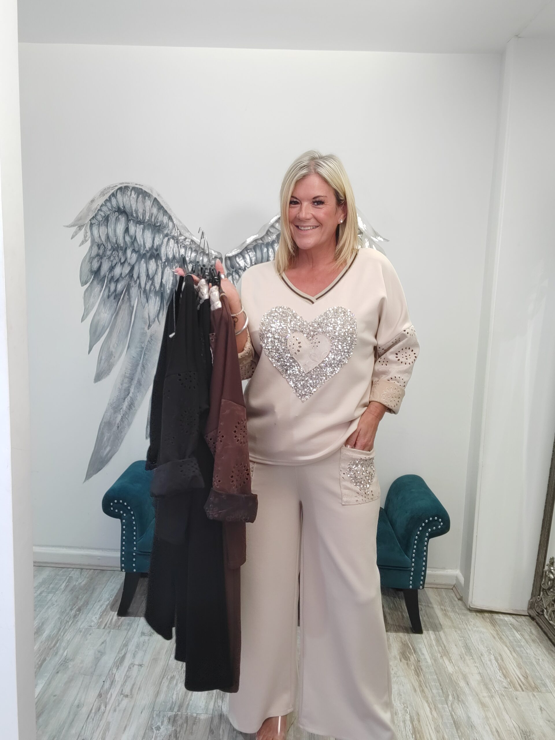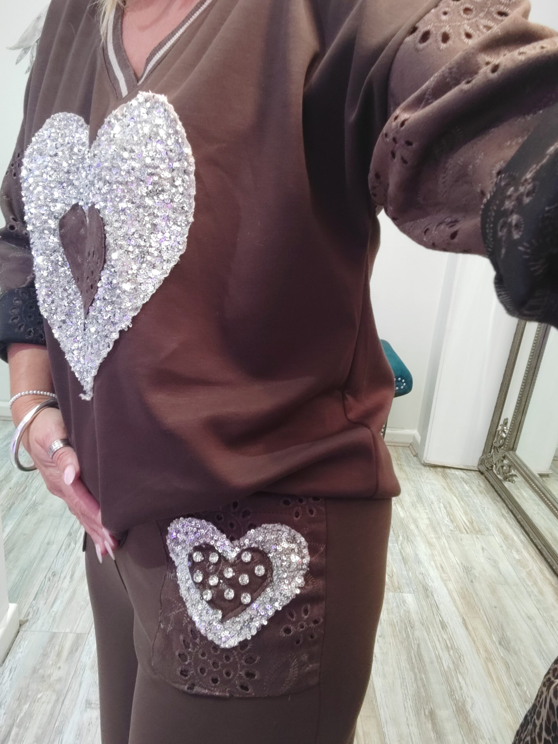 Fabulous wide leg Co-ord with gorgeous sparkle heart at the front of the top and lovely suede broderie anglaise ffel. The bottoms are a wide leg with the suede feel pockets with a diamante heart on one, elasticated waist x