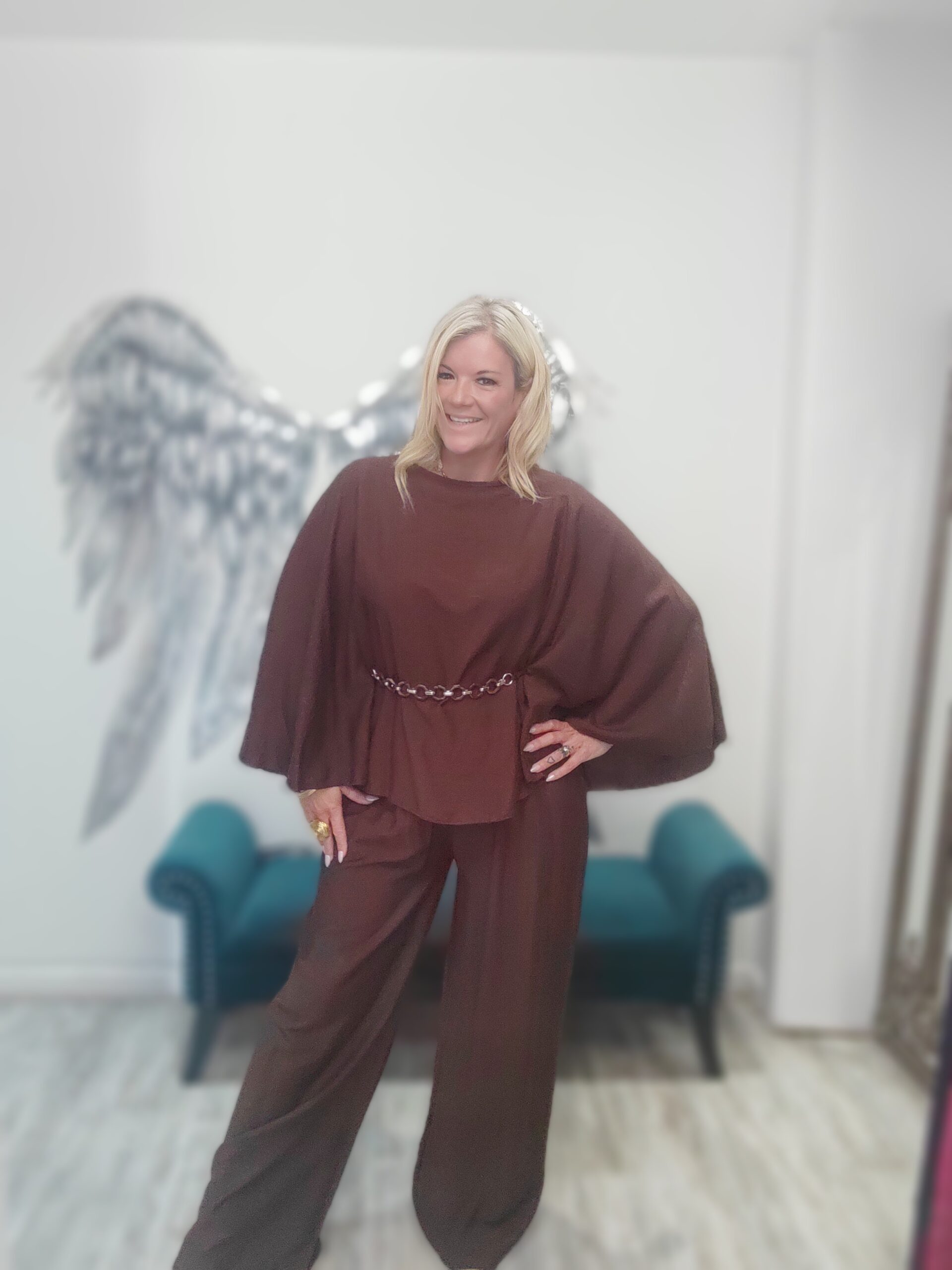 Gorgeous co-ord with wide leg trousers with elasticated waist and pockets. The top is lovely with bat wing sleeve and belt x